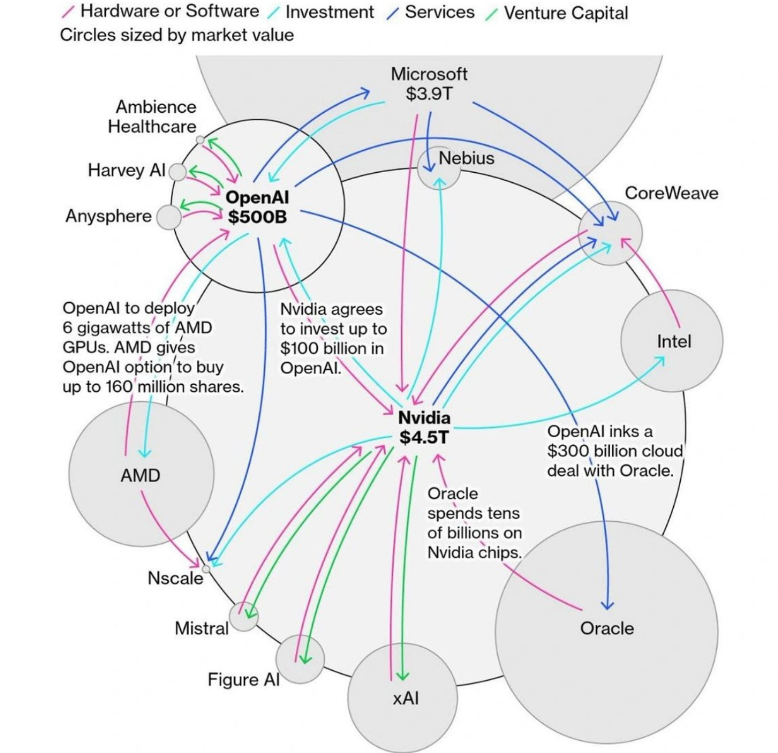 Ha az Nvidia és a Microsoft nem tömné pénzzel az OpenAI-t és sok más hasonló céget, akkor nem lenne szükség az AI chipekre vagy a kapcsolódó felhőszolgáltatásokra, így nem nőne az égig ezeknek a cégeknek az árfolyamai, így nem tudnák támogatni az AI cégeket. (Csak az Nvidia 2024-ben 52 hasonló kockázati tőke befektetést végzett, leginkább AI-ban érdekelt cégekbe, idén már 50 ilyen megállapodást kötött.)