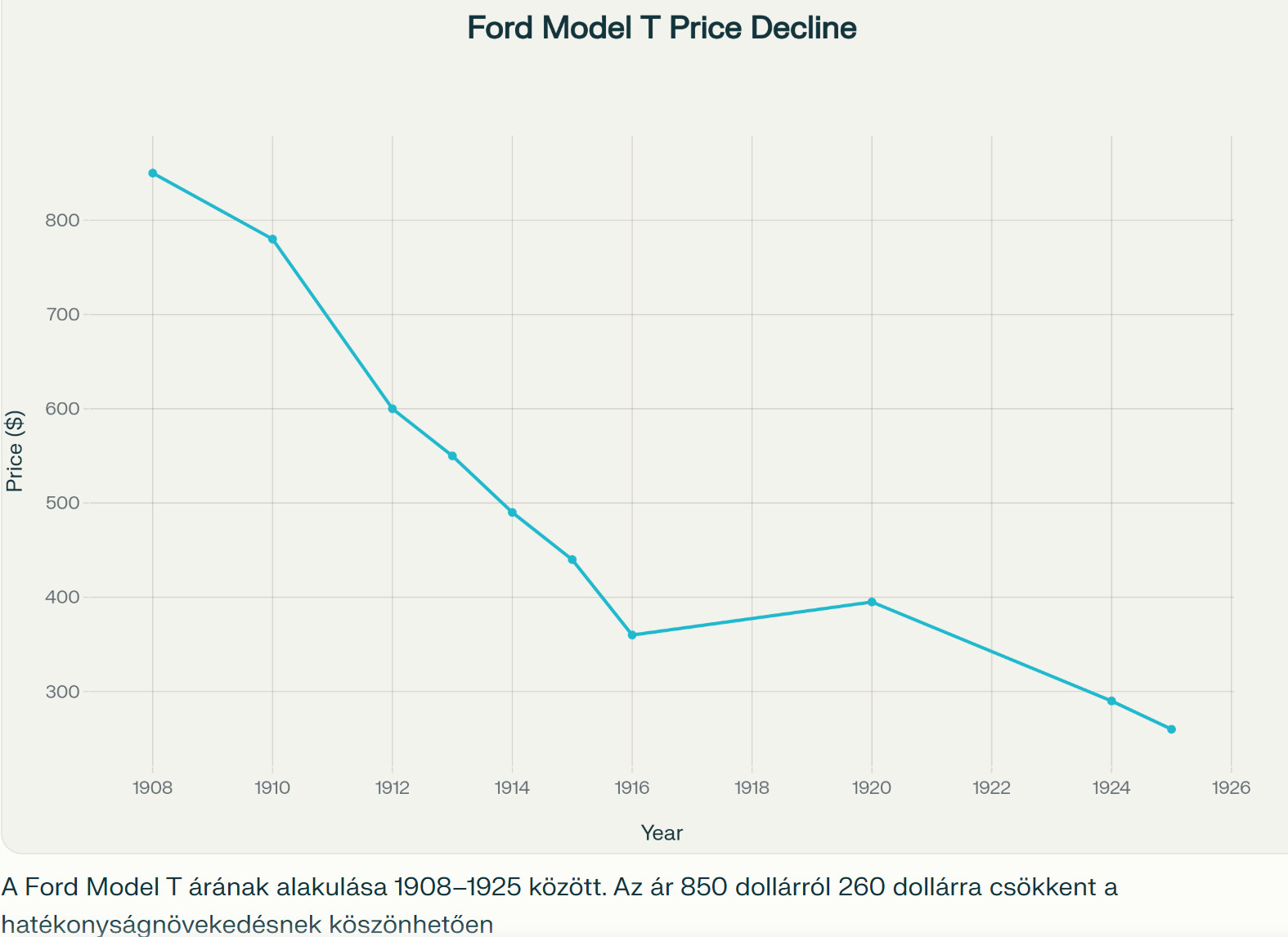 A Ford Model T árának alakulása 1908–1925 között. Az ár 850 dollárról 260 dollárra csökkent a hatékonyságnövekedésnek köszönhetően.