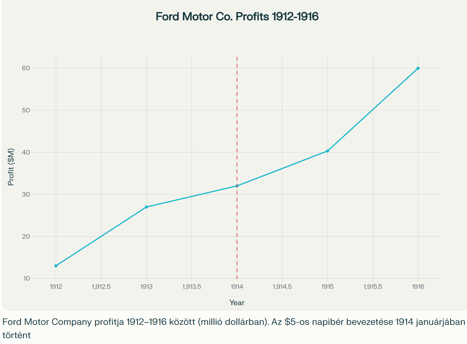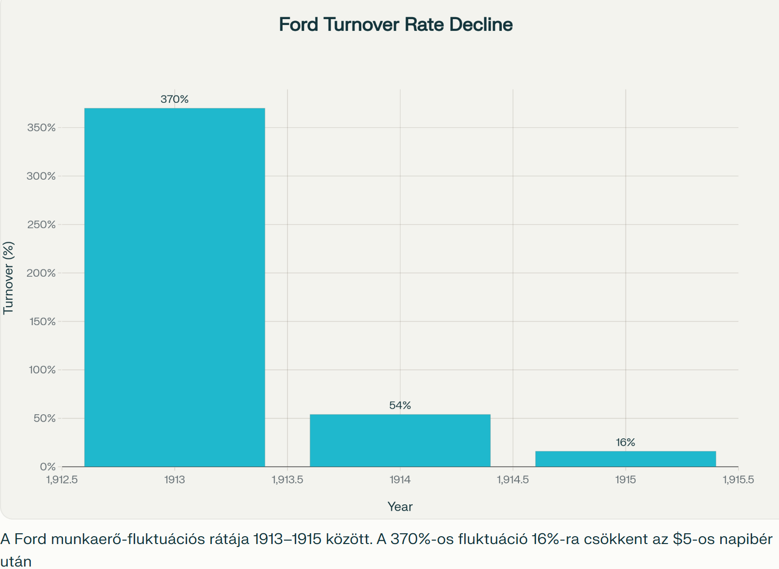 Ford 1913-ban rájött, hogy a magas fluktuáció többet költött neki, mint amennyibe a béremelés került volna. A döntés nem humanista gesztus volt, hanem hideg üzleti kalkuláció.[14][25][15]