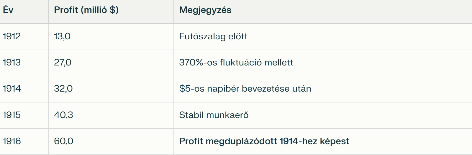 Henry Ford futószalag-forradalma és az $5-os napibér bevezetése együttesen demonstrálják azt az igazságot, amelyet sok mai vállalat még mindig nehezen tanul meg: a munkavállalók alulfizetése nem mindig a legolcsóbb megoldás. Ford vesztesége a magas fluktuációból évente közel 2 millió dollárt tett ki. Amikor megduplázta a béreket, a költségek eleinte megemelkedtek, de a termelékenység, a stabilitás és a minőség javulása révén a profit két év alatt megduplázódott.[12][22][17]