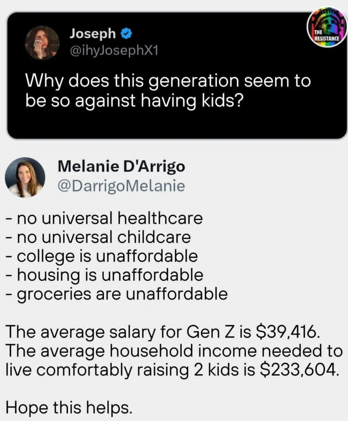 Az Egyesült Államokban is kérdés, hogy miért nem akarnak szülni ezek a gonosz mai fiatalok, miért nem potyogtatják tele az országot gyerekkel. Valaki frappáns választ adott az értetlenkedő kérdésre: