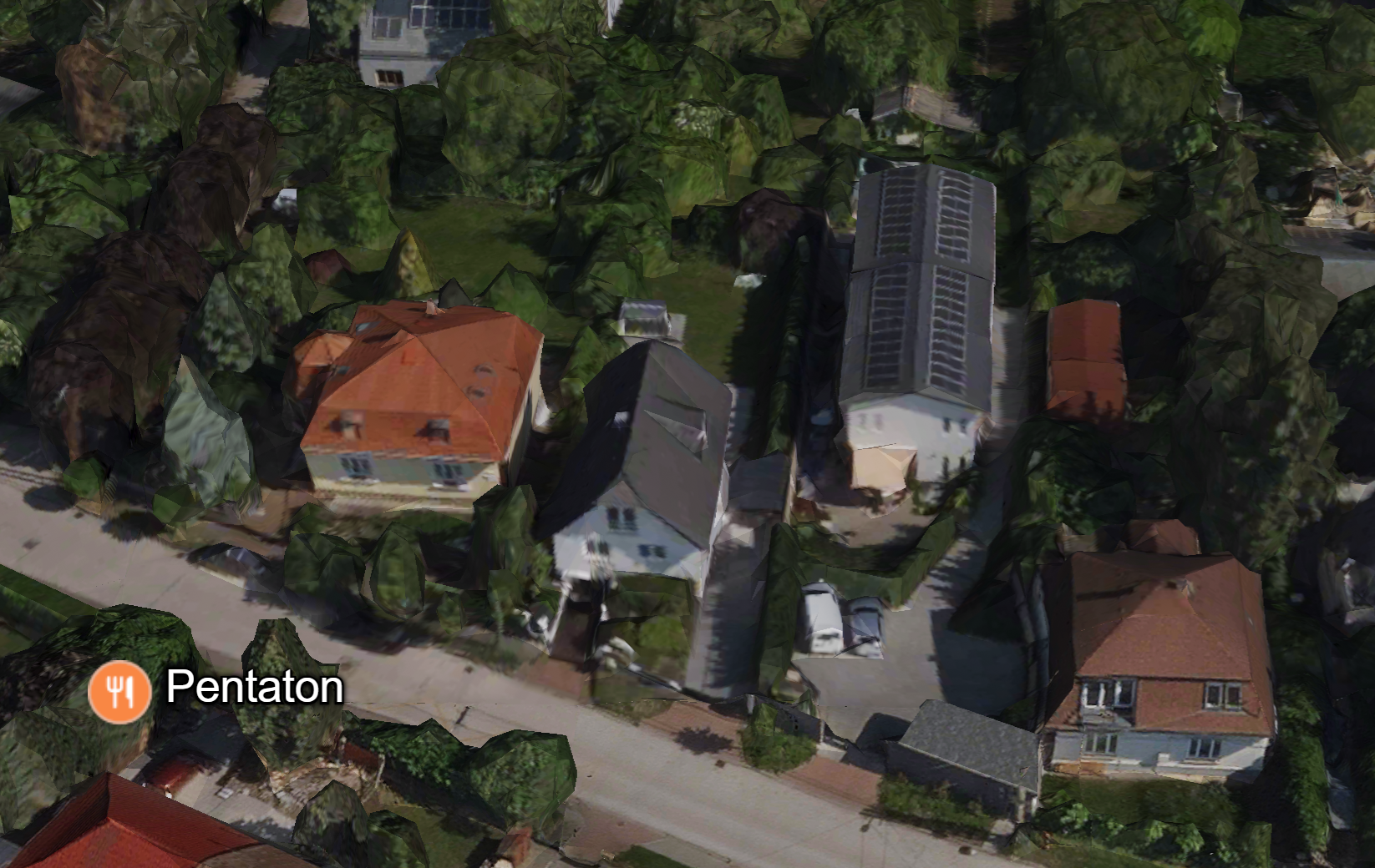 Levonva a tanulságot, kénytelen voltam a régi módszerrel megkeresni az ingatlant, gyorsan meg is találtam. Négyzet alakú ház, nyugatra néző egyedi alakú terasszal, nagy kerttel. Nem volt nagy kihívás. Ami problémás volt, hogy a Google Maps műholdképe gyakran kritikán aluli, torz is és homályos is, jelen esetben konkrétan használhatatlan volt.