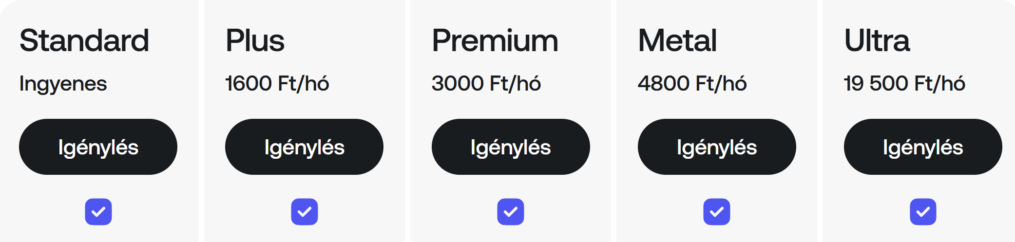 A Metal csomag érdemben drágább, éves fizetés esetén havi 4.800 forint, s nem kínál sokkal többet. 300 ezer forintos ATM használat, az utasbiztosítás a házastársa is kiterjed (valószínűleg olcsóbb őt külön biztosítani, ha évente csak egyszer-kétszer utaztok), ingyenes hozzáférés sakk előfizetésekhez, a RevPontokat nem 2.000 Ft-onként kapod, mint a Prémium csomagban, hanem 1.000 forintonként.